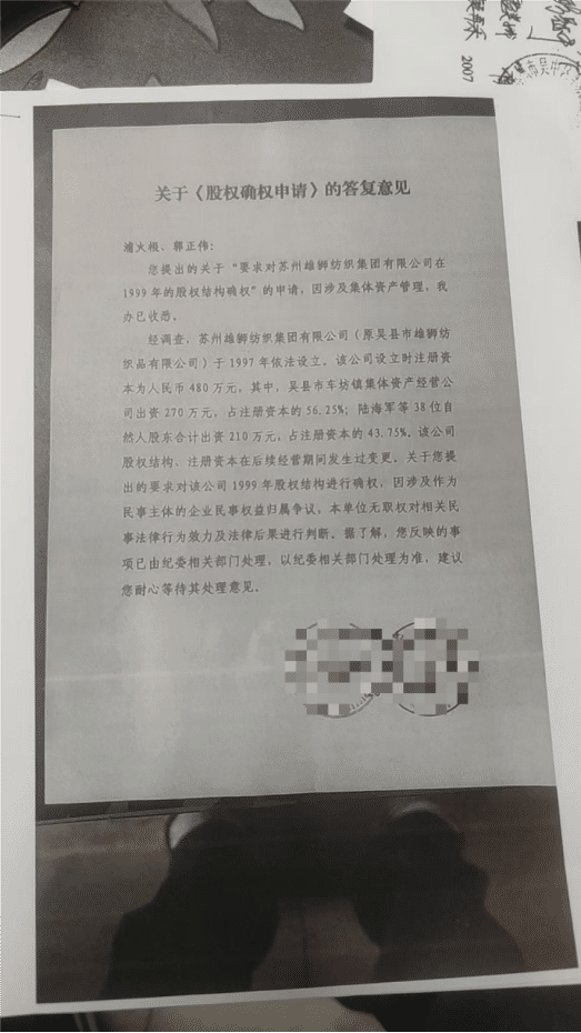 相关部门给出的答复称,2004 年行政区划调整后,原车坊镇划归甪直镇,集体资产相关管理主体发生变更,我们反映的股权归属争议属于 “民事权益归属争议”,超出其职权处理范围,建议我们等待其他相关部门的处理意见。