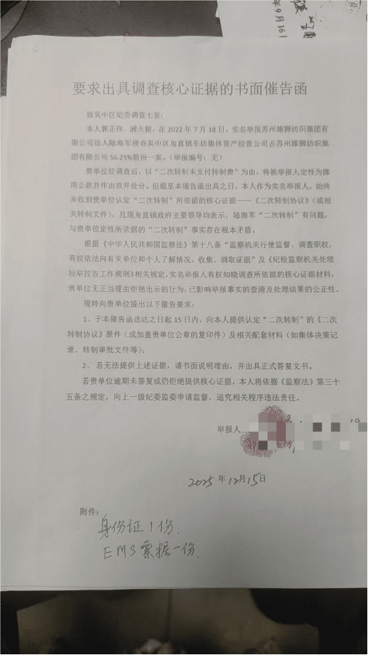 【相关佐证材料】:2025 年 12 月郭正伟、浦火根向吴中区纪委调查七室出具的《要求出具调查核心证据的书面催告函》,实名要求相关部门提供 1999 年二次转制协议及配套决策、审批文件,至今未获有效答复。
